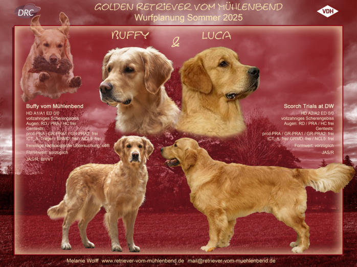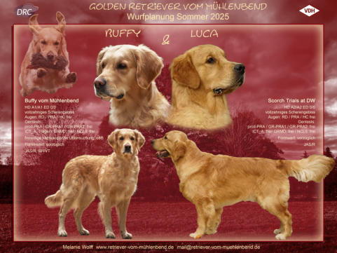 Der D-Wurf ist geplant für Sommer 2025 mit Buffy. Der Decktermin war am 13. Mai, die Geburt wäre dann Mitte Juli, Abgabe Mitte bis Ende September. Als Vater haben wir Luca (Scorch Trials at DW) gewählt: Ein vorzüglich gebauter Rüde aus einer italienischen Dual-Purpose-Linie mit einem eindrucksvollen Rüden-Kopf, sehr freundlichem Wesen, ausgeglichenem Temperament und hervorragenden Gesundheitszeugnissen.Wir erwarten aus dieser Verpaarung gesunde Welpen, von kräftig goldener Farbe, die Arbeitsfreude gepaart mit einer gesunden Mischung aus Temperament und Ruhe und viel Will to please mitbringen.Wenn Sie sich für einen Welpen aus meiner Zucht interessieren, sollten Sie unbedingt Spaß an gemeinsamen, hunde- und retrievergerechten Aktivitäten mit ihrem Hund mitbringen, damit dieser entsprechend beschäftigt und ausgelastet wird. Sei es nun bei der Dummy-Arbeit, jagdlichen Arbeit oder anderen Hundesportarten. Als reine Familienbegleithunde ohne sinnvolle Beschäftigung sind sie aufgrund ihres Temperaments nicht geeignet!Bei Interesse an einem Welpen aus einem Wurf, kontaktieren Sie mich gerne frühzeitig, am Besten mit einer möglichst aussagekräftigen Mail ( mail at retriever-vom-muehlenbend.de ).Was verstehe ich unter „aussagekräftig“? Als kleinen Leitfaden sollte Ihre Anfrage wenigstens zu diesen Punkten Auskunft geben:•wer sind wir / wer gehört alles zum „Rudel“•wo wohnen wir •wie wohnen wir•wer geht welcher Beschäftigung nach und wie lange•haben wir schon Hundeerfahrung, wenn ja welche•warum wollen wir einen Hund•warum wollen wir einen Golden Retriever•was sind unsere Pläne/Vorstellungen für das gemeinsame Leben und die Beschäftigung mit einem Hund