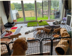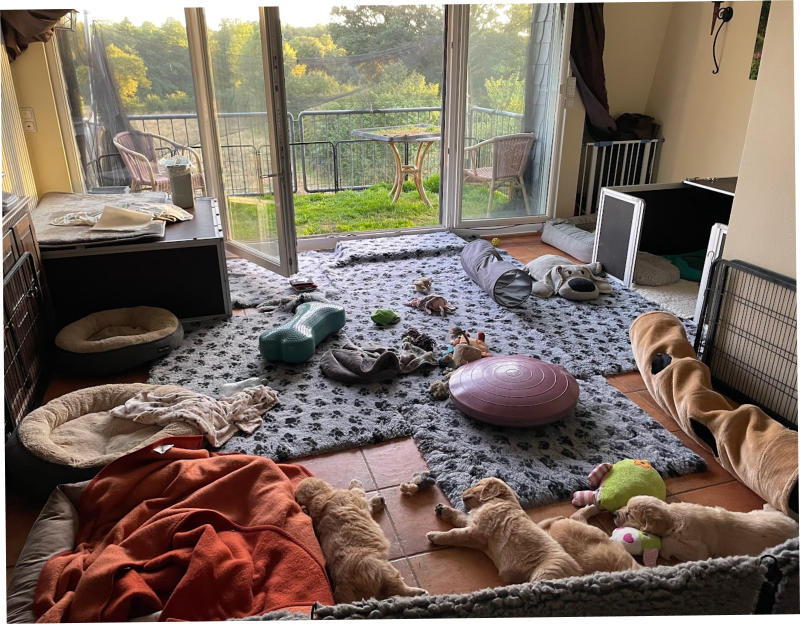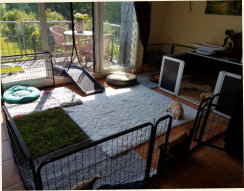 angrenzendem Balkon, wo sie mitten im Alltagsgeschehen dabie sind. Eine Rollrasen-Welpentoilette dient der Prägung auf entsprechenden Untergrund beim Versäubern.