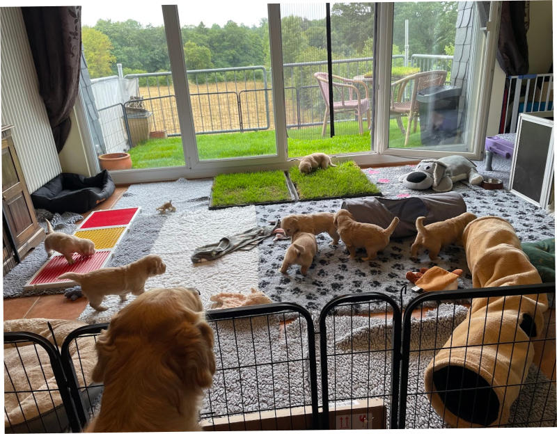 Sobald sie alt genug sind, bekommen sie zudem tagsüber die Möglichkeit, in unserem großen Garten in einem welpensicher abgetrennten, ca 60qm großen Bereich mit