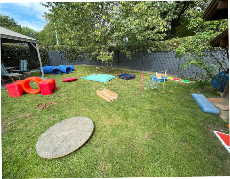 eigenem Gartenhaus und Pavillon als Unterschlupf verschiedenste Außenreize und Bodenuntergründe kennen zu lernen. Sowohl drinnen wir draußen unterstützen